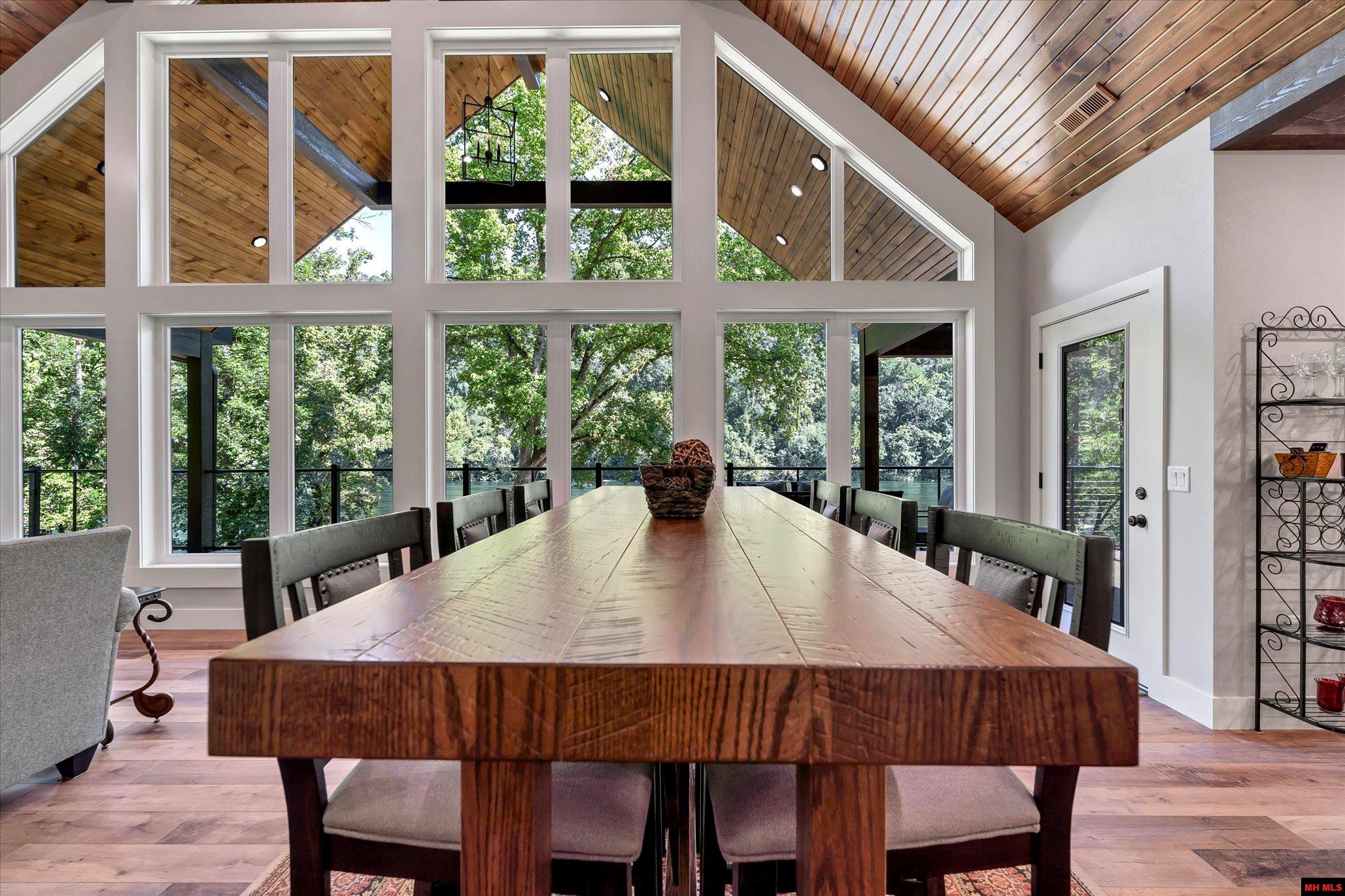 Enjoy riverfront living! 4 BR, 2 BA home in a peaceful & picturesque location w/unobstructed views of the White River and rock bluffs. Outdoor living features: beautifully crafted flagstone fire pit, rock slope stabilization and observation deck in a popular fly-fishing spot near Wildcat Shoals. The exterior showcases low-maintenance Diamond Kote siding, expansive aluminum deck w/ cable railing, a gapless upper deck provides dry patio area underneath. A modern, rustic aesthetic welcomes w/ wall of windows, beautiful woodwork & vaulted ceilings to showcase the spectacular view. A spacious lower level w/ second living area, laundry, bathroom, two bedrooms w/ river views, flex/safe room. Thoughtful construction includes 2 HVAC units, spray foam insulation, solid core doors, poured concrete basement.