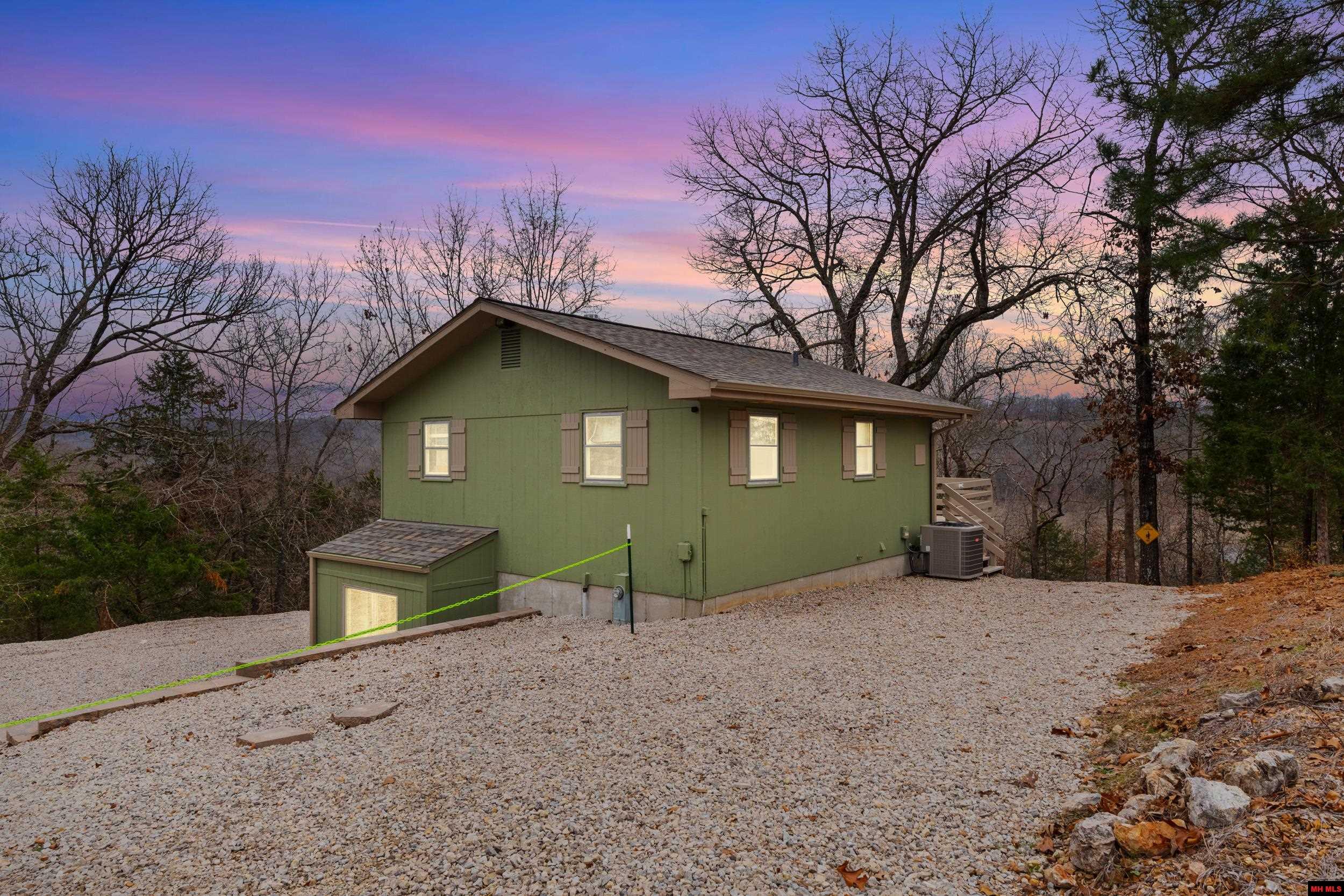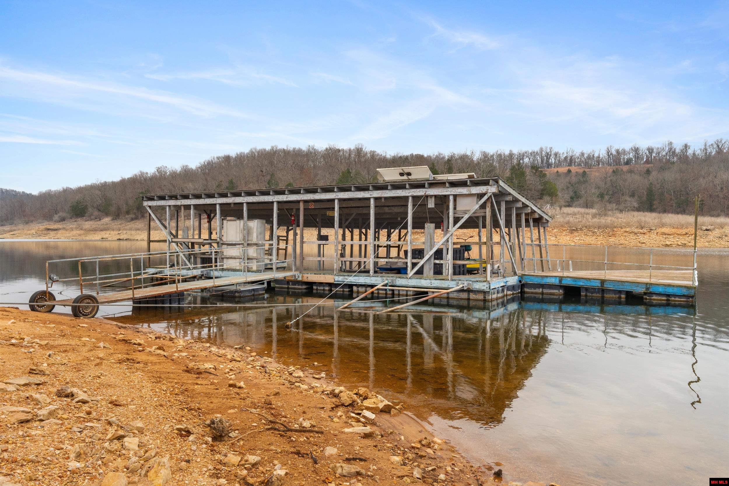 This unique property features a 43’ x 24’ boat dock plus swim deck (1300sf), a 24’ x 50’ (1200sf) shop, and a cozy 1196sf house. Yes, the dock is bigger than the shop, and the shop is bigger than the house. Significant updates have been done: new gravel driveways, a retaining wall, roof, gutters, HVAC, exterior paint, deck work, interior painting, and more. Set on three lots with no restrictions, the property borders gov’t corps on Bull Shoals Lake. The house offers a complete living space upstairs—with a kitchen, two beds, a full bath, and a family room. The fully renovated downstairs, accessible via outside entrance, boasts a large bonus room, a full bath, and a large laundry area. This space could be a great bunk space, game room, man cave, rental, etc. All furniture and appliances stay as-is. The dock includes 4 bays, three with hydraulic lifts, solar panels, a large swim deck and a fish cleaning station. The 24’x50’ clear span shop has electricity, lighting and a concrete floor.