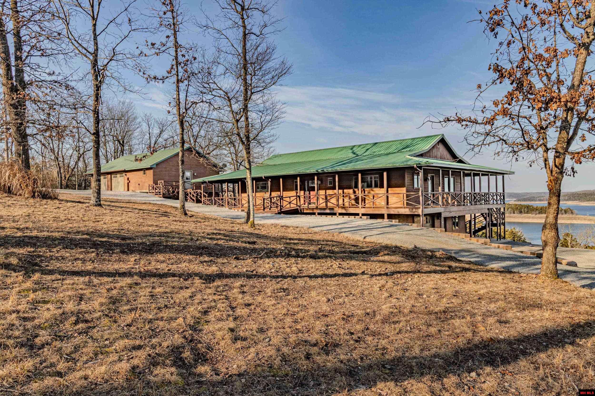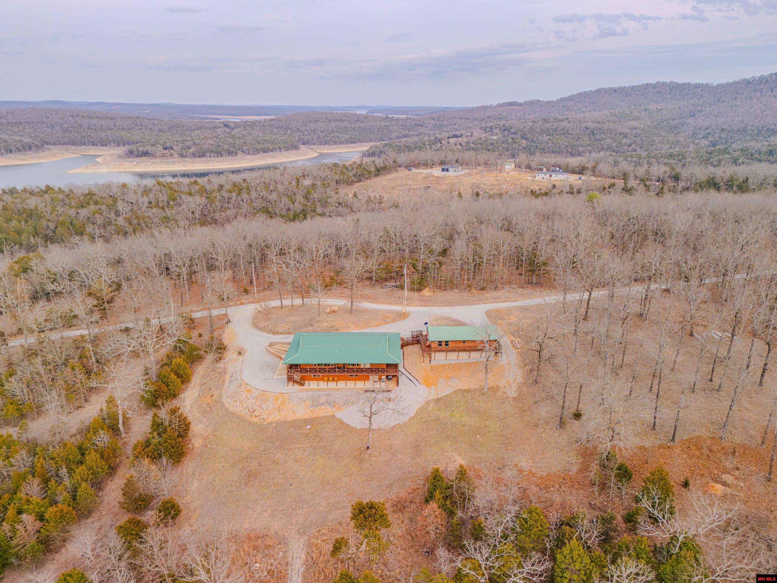 Discover your dream lake home on 10.09 pristine acres m/l with breathtaking sunrise and sunset views over Bull Shoals Lake. Bordering government land on multiple sides, this immaculate property offers exceptional privacy and direct access to nature. The home features 3,392 sq ft of living space with hardwood and tile floors, vaulted ceilings, and expansive windows showcasing the lake. Designed for comfort, it includes three bedrooms, three baths, and two living areas. Enjoy the wraparound porch or walk out from the basement to lush, wildlife-filled surroundings that feel like a private retreat. Additional features include a spacious pantry and a 560-sq-ft one-bedroom, one-bath apartment ideal for guests or rental income. With three garages plus an aircraft hangar, there’s ample space for vehicles, storage, or aviation needs. Located near Pine Mountain Airport for easy fly-in, fly-out convenience, this property is more than a home—it’s a peaceful lakefront sanctuary.