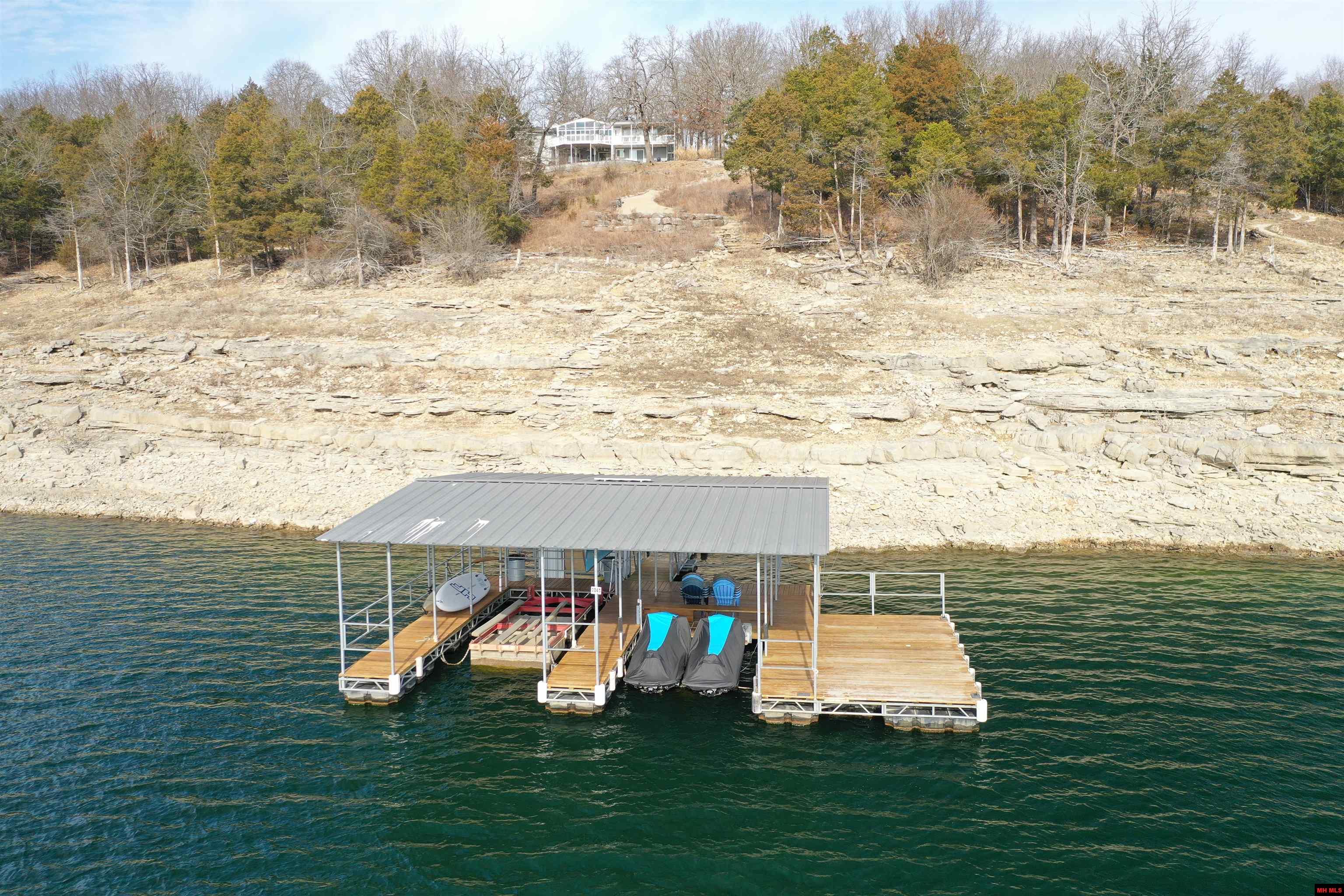 Experience true lakefront living on Bull Shoals Lake in this rare retreat designed for comfort, space, and unforgettable views. Just a short walk to the water, this spacious home features a private 2-stall solar-powered boat dock with swim platform, a beautifully landscaped path to the shoreline, and inviting outdoor spaces including a fire pit, large patio, and expansive deck with a heated and cooled sunroom. Inside, the open kitchen, dining, and living area showcases a wall of windows overlooking the main channel. The lower level offers generous guest space with multiple private baths, while the recently updated primary suite features a soaking tub and walk-in shower. A 15' x 22' shop adds extra storage, and recent updates like a new roof, two heat pumps, and a wood stove provide year-round comfort in this one-of-a-kind lakefront escape.